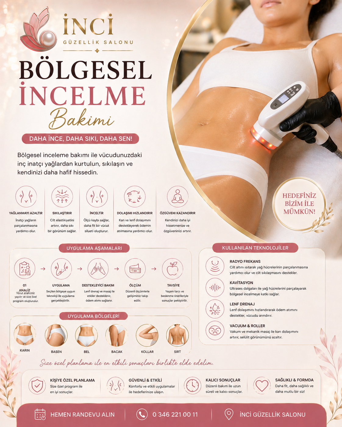 İnci Güzellik Salonu’nda uygulanan bölgesel incelme işlemleri, kişinin ihtiyaçlarına göre planlanır ve uzman ekip tarafından gerçekleştirilir. Uygulama sırasında kullanılan teknolojiler sayesinde cilt yüzeyinde sıkılaşma sağlanırken, daha düzgün ve şekilli bir görünüm elde edilir.