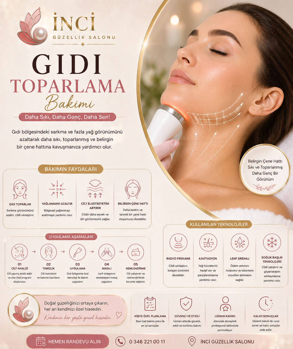 İnci Güzellik Salonu’nda uygulanan gıdı toparlama bakımı, cilt yapınıza uygun olarak planlanır ve modern cihazlar ile desteklenir. Uygulama sayesinde cilt sıkılaşır, toparlanır ve daha genç bir görünüm kazanır.