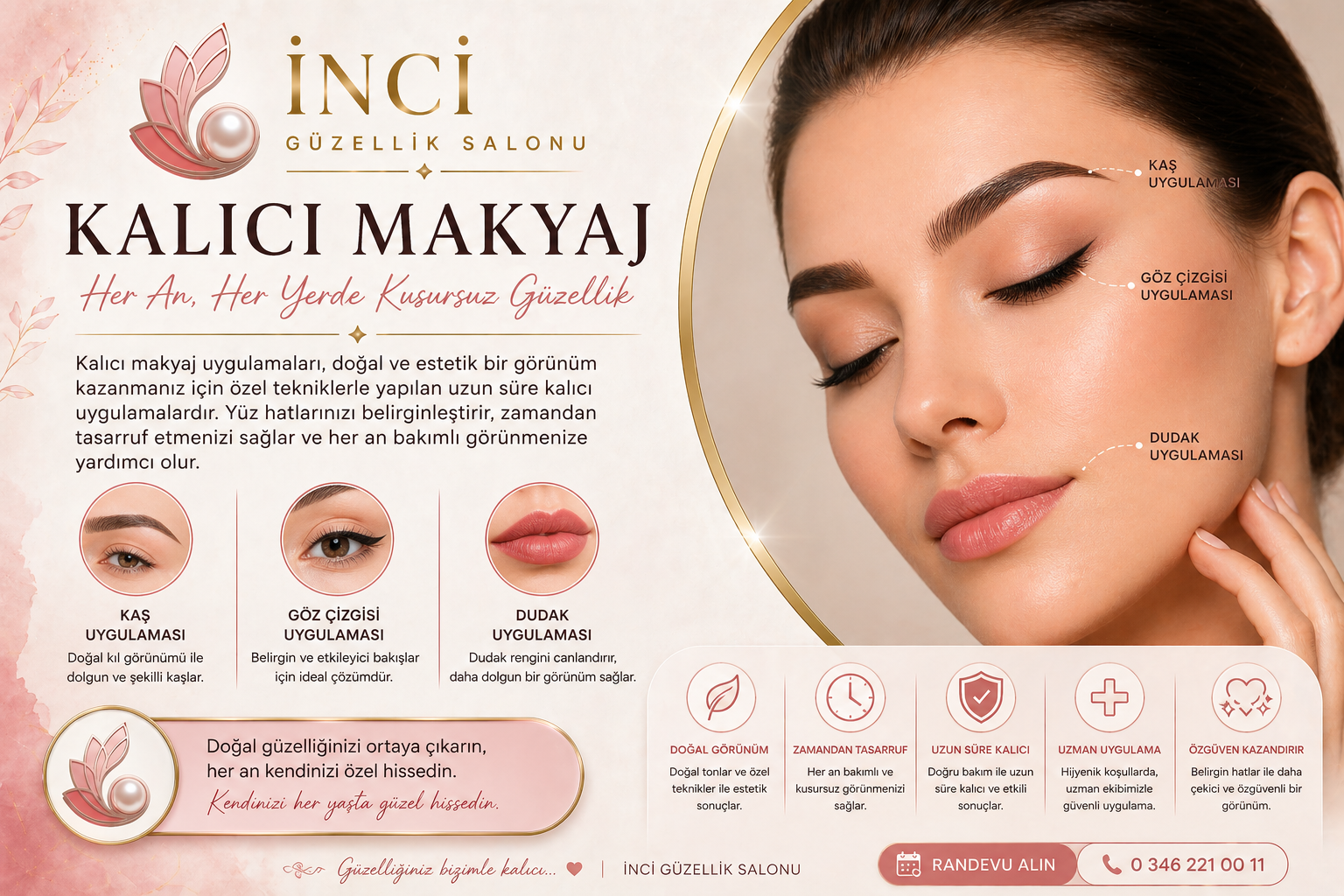 Sivas’ta profesyonel ve güvenilir kalıcı makyaj hizmeti ile zamandan tasarruf ederken kusursuz bir görünüme sahip olmak için İnci Güzellik Salonu’ndan randevu oluşturabilirsiniz.