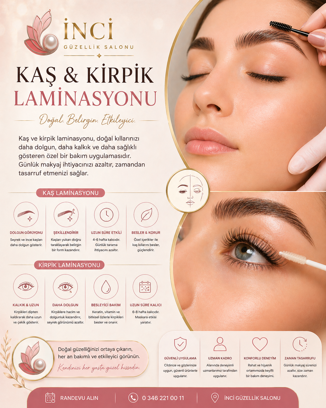 İnci Güzellik Salonu’nda uygulanan laminasyon işlemi, yüz hatlarınıza ve mevcut kıl yapınıza uygun olarak planlanır. İşlem sırasında kullanılan besleyici içerikler sayesinde kaş ve kirpikler hem şekillenir hem de güçlenir.
