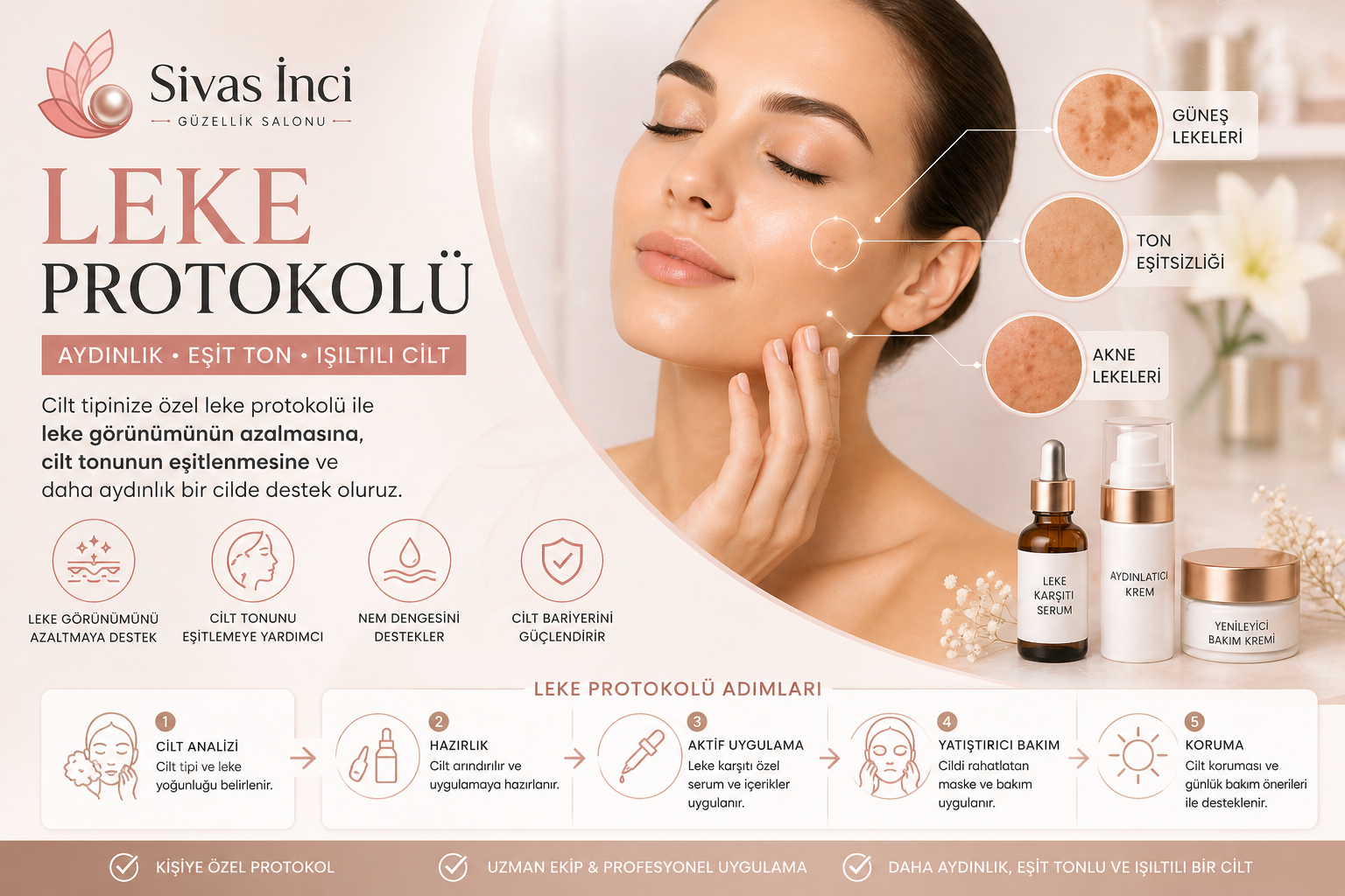 Cilt analizi ile kişiye özel planlama yapılır Cilt yüzeyi nazikçe arındırılır Leke görünümünü azaltmaya yönelik profesyonel içerikler uygulanır Cilt bariyeri desteklenerek bakım tamamlanır