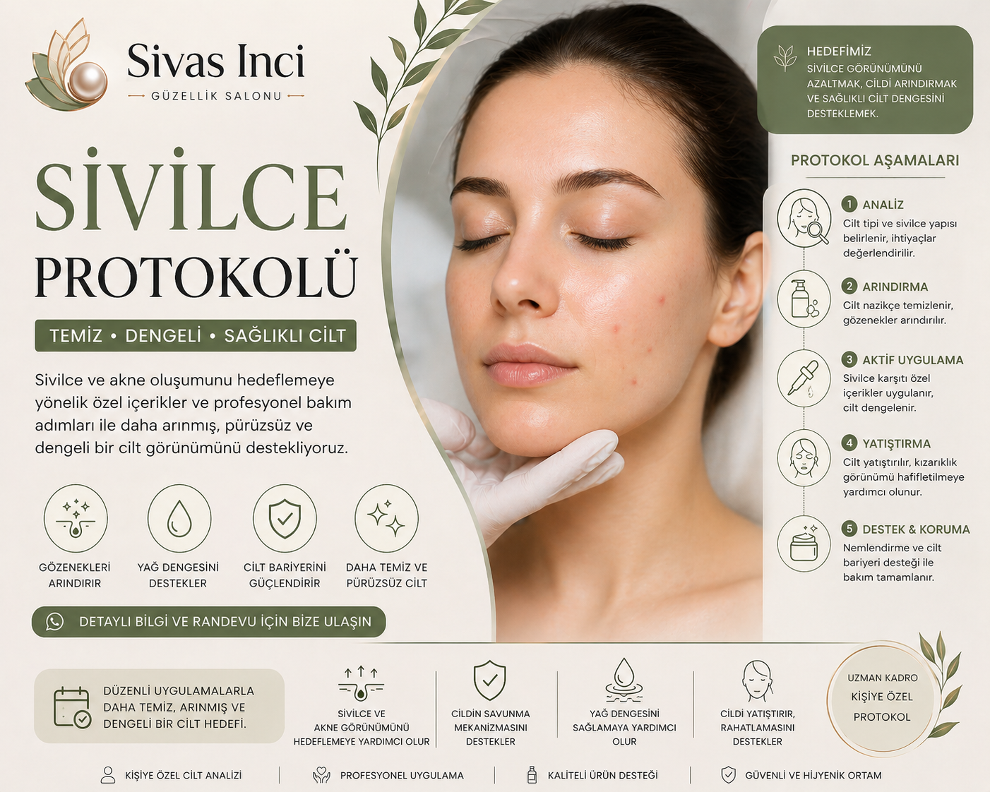 Cilt analizi ile kişiye özel planlama yapılır Cilt derinlemesine temizlenir ve arındırılır Sivilce ve akne görünümüne yönelik profesyonel içerikler uygulanır Cilt yatıştırılır ve nem dengesi desteklenir